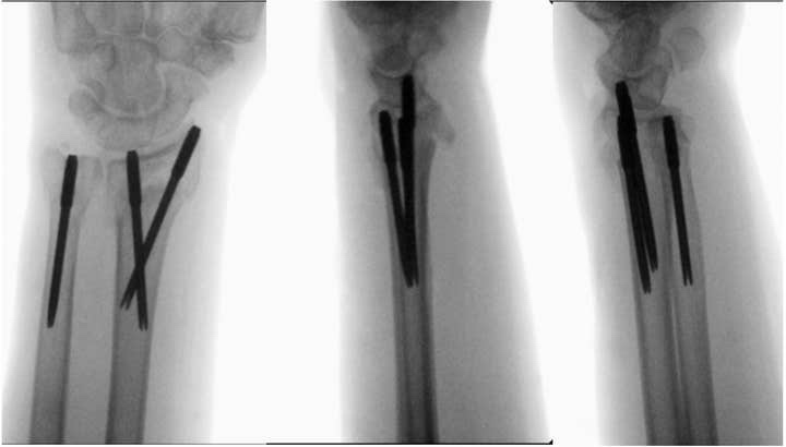 Anteroposterior, lateral, and oblique postoperative images (B) of distal radius and ulna fractures fixed with T-Pins.