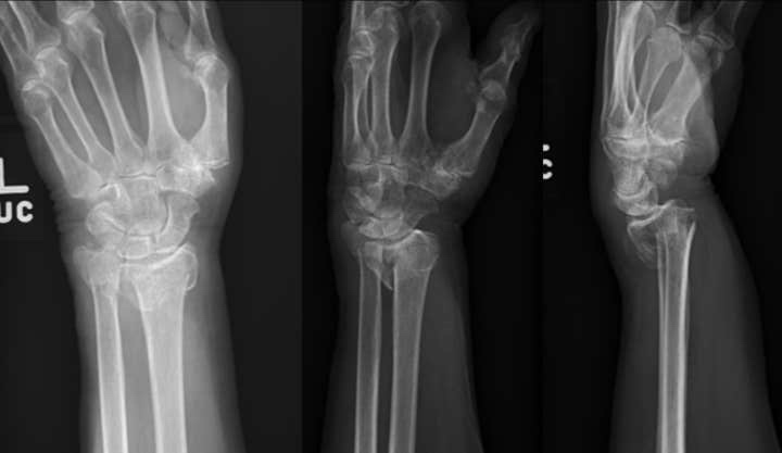 Anteroposterior, lateral, and oblique preoperative images of distal radius and ulna fractures